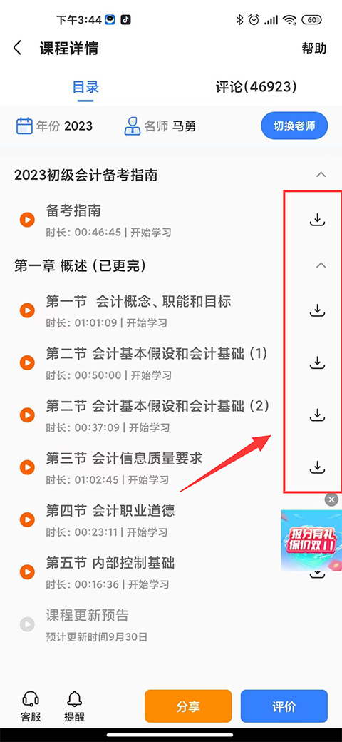 3、进入到课程界面,选择右下方的“下载”图标,就可以下载需要的课程了。
