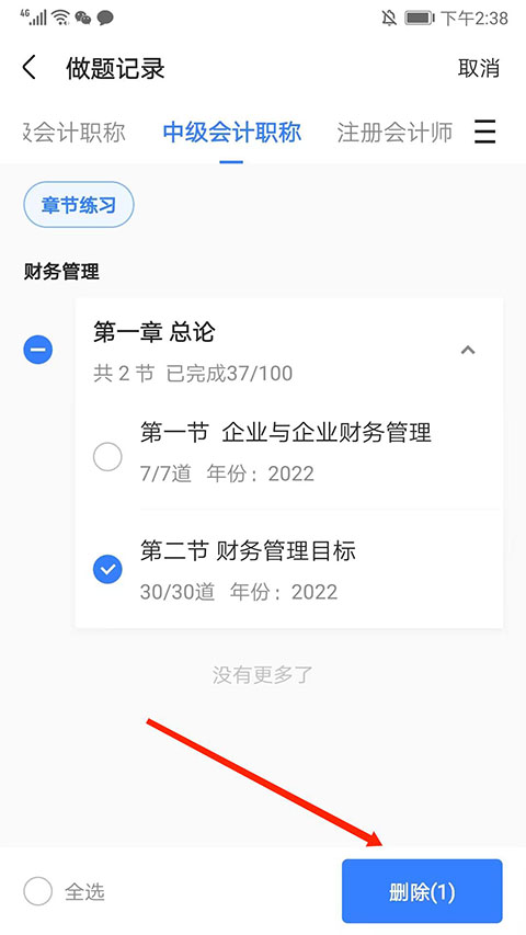 4、勾选需要清除的内容后,点击右下角“删除”即可清除做题记录。