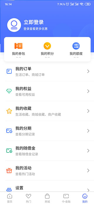 6、在我的中有着我的订单、我的卷包、我的积分、我的额度、权益、收藏、随借金、活动等功能: