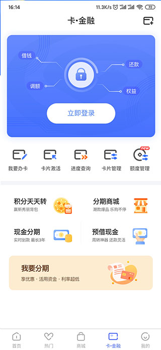 5、在卡。金融中有着预借现金、我要办卡、卡片激活、我要分期、卡片管理、还款、调度等功能: