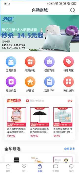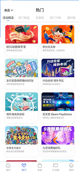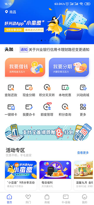 2、然后就能看到首页、热门、商城、卡。金融、我的五个板块,其中在首页中有着,查账还款、现金分期、积分天天转、本地优惠、兴动商城、一键绑卡等功能:
