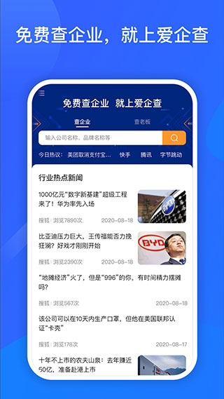 1、首先下载/安装/运行爱企查,然后就会看到如下图,有着查老板、查企业、查老赖、行业热点新闻等功能: