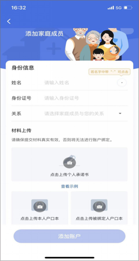 1、如果添加的家庭成员小于16周岁,直接点击添加账户按钮即可完成账户关联;