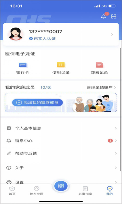 1、点击底部菜单【我的】进入个人中心页面,在【我的家庭成员】版块点击图标“+”添加亲情账户(“亲情服务”即为未成年和无智能手机的老人提供医保电子凭证服务)