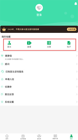 5、点开我的,可以查看医生、直播、文章、帖子等。