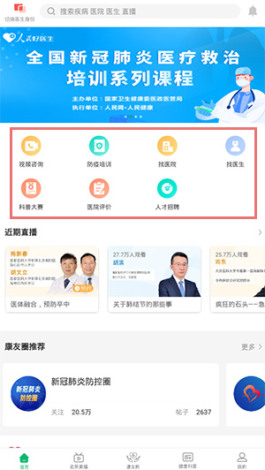 1、在手机上运行人民好医生,可以看到有首页、名医直播、康友圈、健康科普、我的五个板块;