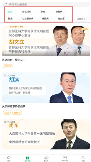 3、点开名医直播,可以看到有肿瘤、心脏病、肺癌、心血管疾病、糖尿病、高血压等多种疾病专家在线直播;