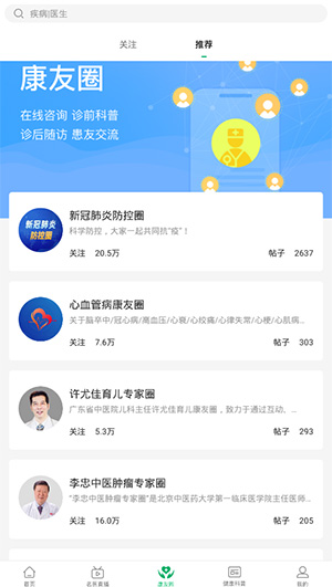 4、点开康友圈,支持在线咨询、诊前科普、诊后随访、患友交流等;