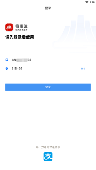 2、输入手机号码后点击“获取验证码”并输入验证码(当然你也可以选择支付宝第三方账号快速登录)