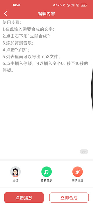 2、这里小编选择的是转语音,只需要输入文字,点击立即合成就可以转换了;