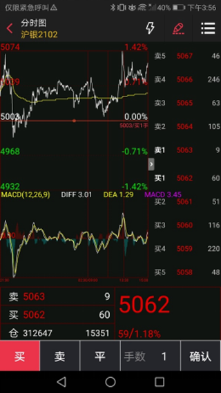 点击画线下单,页面底部弹出画线下单的操作区域,默认选中买开选项,分时区域中出现可手动滑动的线,当选中某一具体价格的时候,在分时区域线的左下方会出现当时的价格,交易方向与下单手数的信息,用户点击确认就进行画线下单的操作;如果需要更改手数,则可在手数框中输入新的手数。