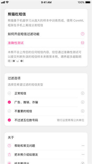 回想到双11、双12的各个电商的短信轰炸是否还是吐槽不止,是不是做梦都想屏蔽它们呢?这里小编带来了一款于iOS端CoreML机器学习的垃圾短信过滤应用:熊猫吃短信苹果版,自带智能模型,无需联网,可以直接在手机上离线过滤广告及垃圾短信,不会收集您的任何信息,更不会上传您的短信内容,超级实用。相较于其他同类拦截软件来说,该软件还是更脱颖而出,准确性也比较强,不仅可以非常准确的从语义层面对短信进行分类,还能够通过识别一个短信的语义特征,就可以精准的判断收到的短信是正常短信、公益短信还是广告骚扰短信等等,而且使用起来也非常简单,只需在信息中选中未知与过滤信息并开启,就会默默的帮你吃掉垃圾短信,再也不用担心被骚扰短信轰炸啦。