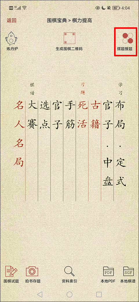 2、在棋力提高界面中找到并点击“摆题搜题”选项;