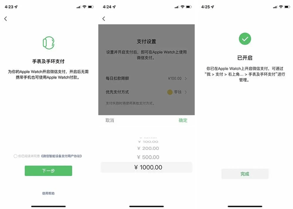 2、在手机微信上同意《微信智能设备支付用户协议》,设置每日限额、支付方式,并输入支付密码确认,就可以开启手表支付功能了。微信支付支持最高每日 1000 元人民币的支付限额。