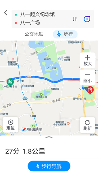 您可以在主界面底部选择公交地铁、步行两种方式来规划路线。输入您的起点位置和终点位置(默认起点为您的当前位置),搜索您需要的路线。