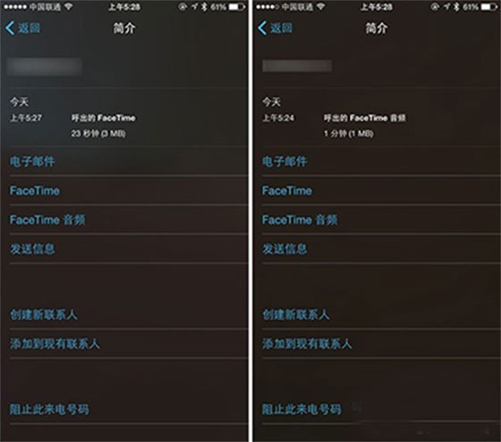 无论是视频 FaceTime 还是音频 FaceTime,通话简介中发起通话的时间以及时间。下方还有快捷的各种操作,包括电子邮件,再次进行 FaceTime 或 FaceTime 音频通话,发送信息以及阻止此来电号码。相信大家看到这里就知道了流量查询方法,我们可以看到通话时间的右侧括号中有实际耗费的流量,就像图片中23秒的 FaceTime 视频耗费了3MB 流量,而1分钟的 FaceTime 音频耗费了1MB 流量。