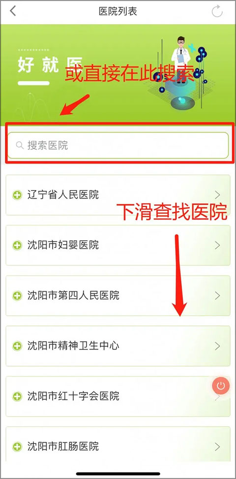 2、下滑选择或者直接在搜索框输入医院名称搜索相应医院,点击医院名称→“预约挂号”;