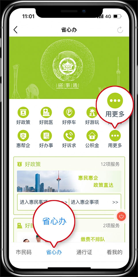 1、打开盛事通ios版,点击“省心办”-“用更多”