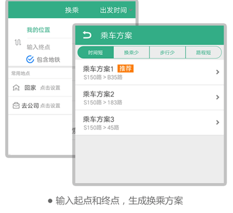 3、“换乘”页面提供公交换乘查询,输入起点、终点进行查询。