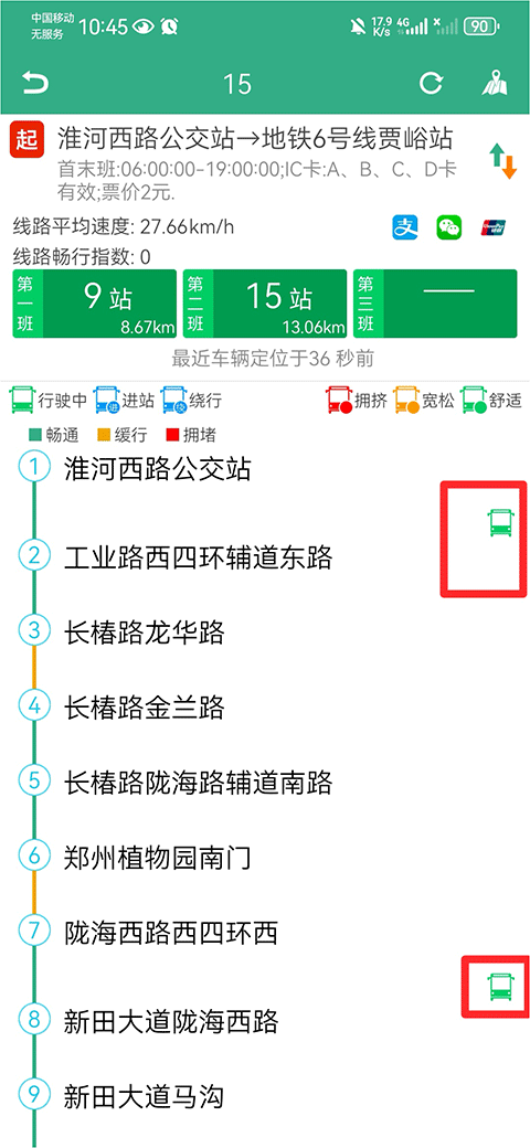 2、进入后可以看到该公交车所行驶的所有线路,用户可以根据线路后面显示的公交车图标来查看公交车到哪里了