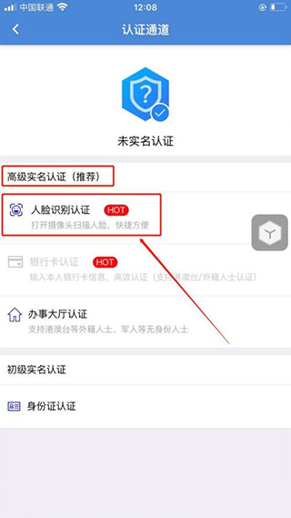 3、选择“高级实名认证”,按系统提示完成认证过程。只有进行了高级实名认证,才可以办理政府事务的线上申请等。