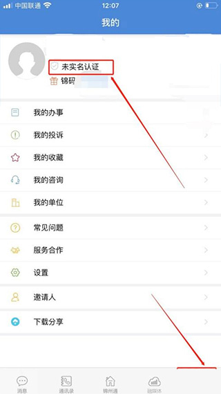 2、点击APP底部导航栏“我的”,在头像右侧,点击“未实名认证”,进入实名认证环节。