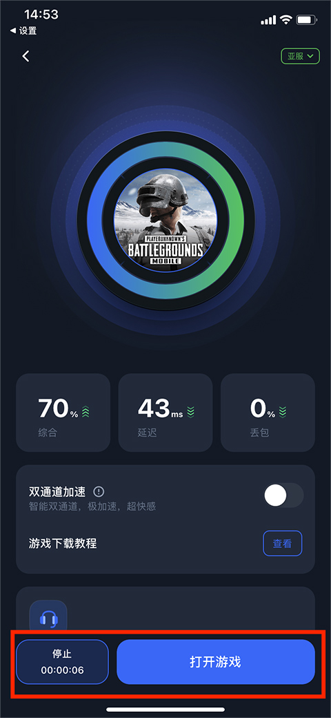 6、游戏加速成功,可看到【综合】、【延迟】和【丢包】等加速信息,用户可以自行选择【停止加速】或者【打开游戏】,