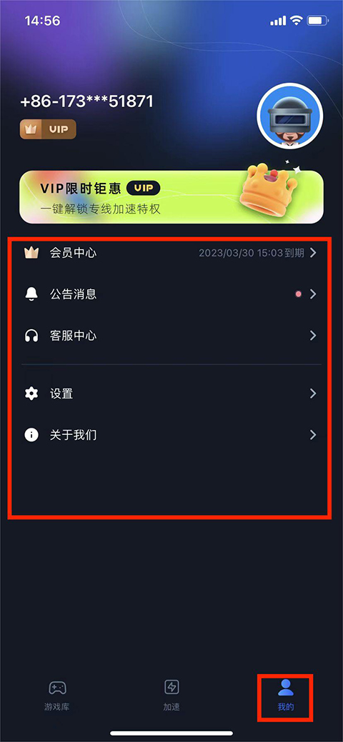 8、进入【我的】界面,可看到用户会员信息、加速剩余时间以及进行客服咨询和手游加速器的相关设置,以上就是海豚手游加速器的使用教程了。