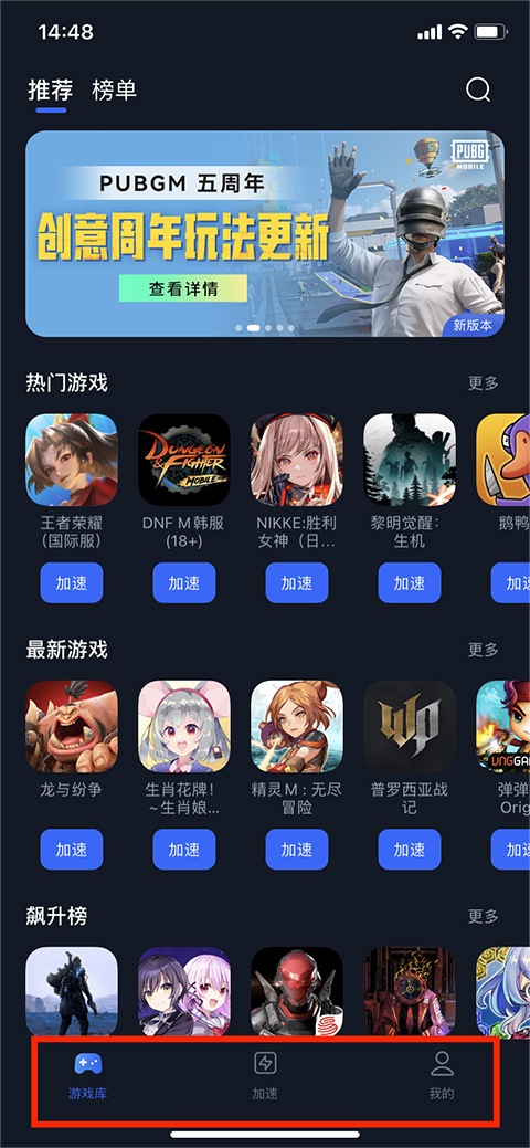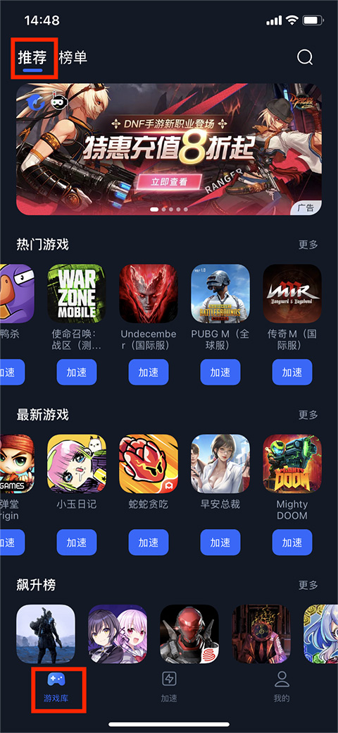 2、进入【游戏库】界面,在【推荐栏目】可看到【热门游戏】、【最新游戏】和【飙升榜】游戏类型分栏,用户可根据需求选择需要加速的游戏,