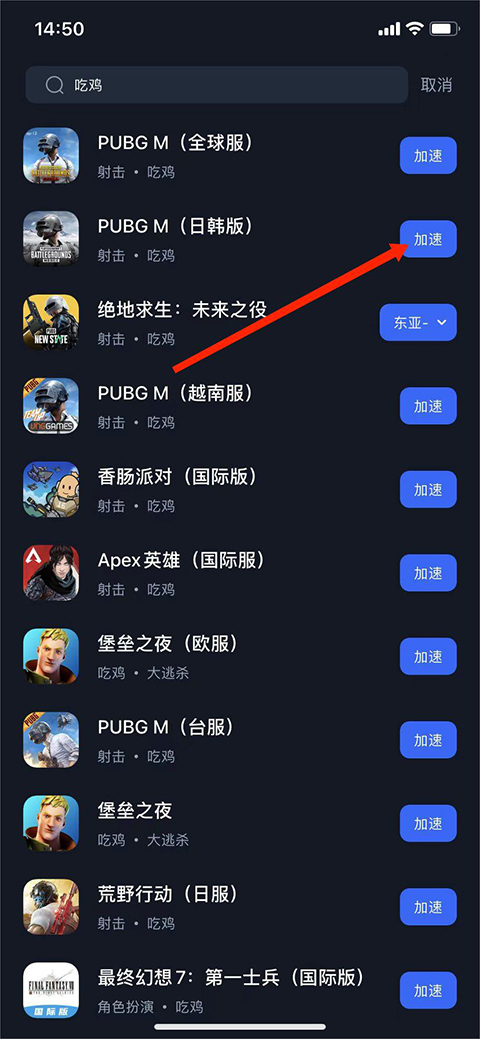 4、这里以【吃鸡】为例,可看到出行相关类型的游戏,选择需要的游戏点击【加速】选项即可,这里以【PUBG 日韩版】为例,