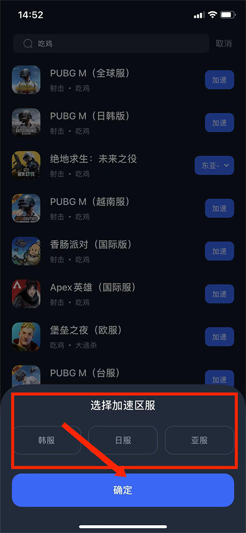 5、弹出加速区服选项,这里以【亚服】为例,点击【确定】选项,