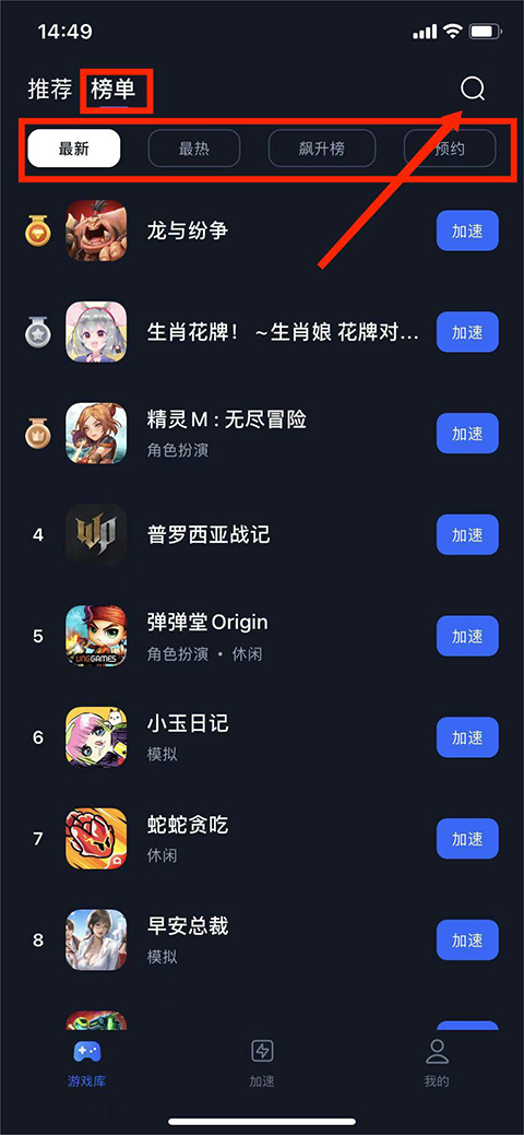 3、在【榜单界面】,可看到有【最新】、【最热】、【飙升榜】和【预约】游戏分栏,用户可以在这里选择相应的游戏,也可以选择右上角【放大镜】图标输入游戏名称进行查找,
