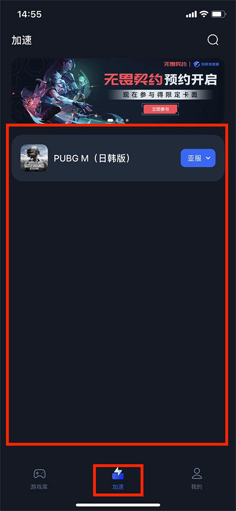 1、打开海豚手游加速器ios版,进入应用界面,可看到分为【游戏库】、【加速】和【我的】选项,