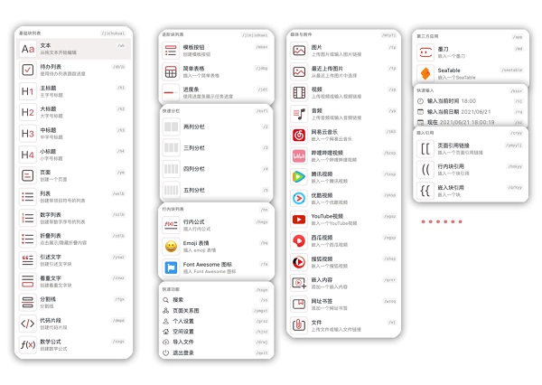 下方是/目前可以唤起的所有内容类型和功能。它们后面均有快捷键显示(你将这些字母直接替换成中文也是一样的):