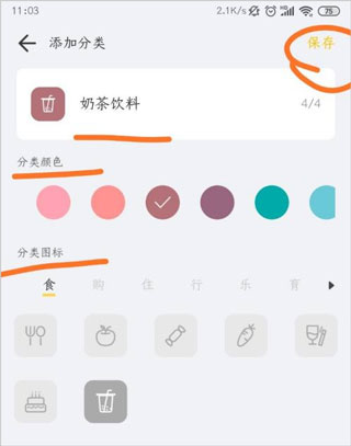 4、输入分类名称,选择颜色和喜欢的图标,最后点击保存