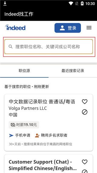 1、登入indeed工作搜索ios版软件后,可以在搜索框中输入:职位、关键词或者是公司名称;