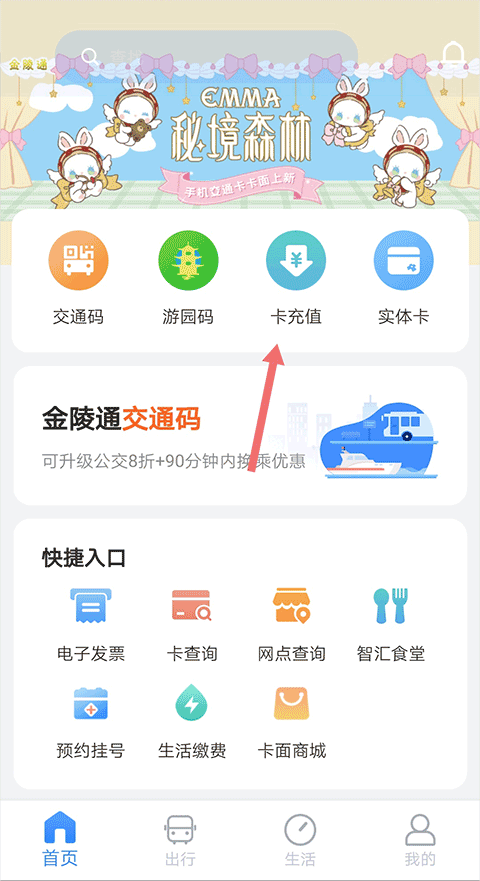 3、如果没有实体卡可以在app首页处点击【金陵通交通码】,进行电子公交卡的申请,申请成功后即可在线完成充值操作
