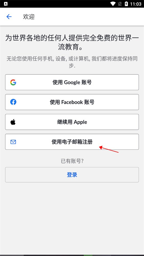 2、然后就可以在登录界面点击使用电子邮箱注册选项。