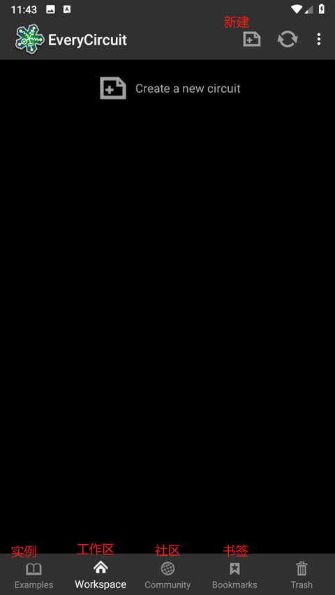 App由工作区、社区、书签、示例几部分构成。工作区是电路制作的区域,我们制作的电子电路也可以保存到工作区,以便日后使用;社区内可以分享你设计的电路,也可以看到别人分享的电路;示例中提供了一些经典的电路,你可以先去学习模板的电路,然后去设计自己的电路。
