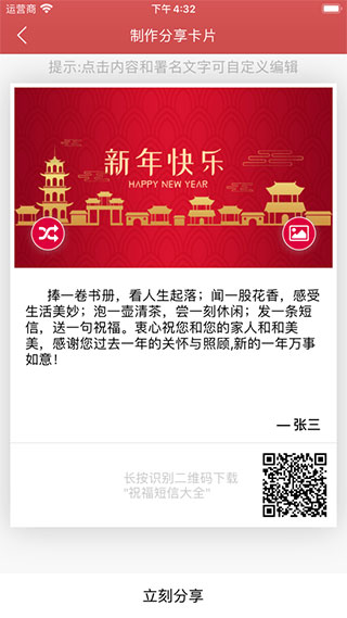 新的一年即将到来,你是否为了写条祝福短信绞尽脑汁?而新年祝福短信大全苹果版是专门为苹果用户所打造的一款祝福语短信大全,不仅涵盖了热门的祝福语,还可以一键将其制作成贺卡署名文字,分享给好友。忙碌了一整年,在这一刻,归家游子收获到亲朋好友的祝福该是一件多么幸福的事情呢。因为爱所以爱,就为她或他编辑一条条美妙的幸福感爆棚的短信吧,这里有海量的短信祝福语,涵盖各种分类,拥有文字发送或贺卡图文并茂的发送快捷功能,让幸福的文字漂流到她或他的心里。优美的语言,真挚的祝福,传递浓浓的爱意,你还在等什么,快来下载试试吧。