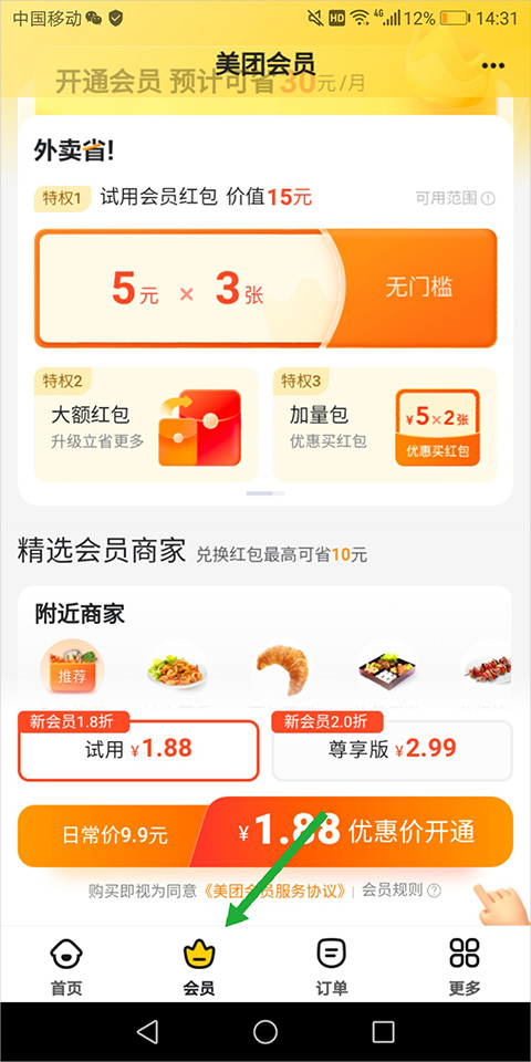 会员仅对部分城市的用户开放购买,享有购买资格的用户可以在美团外卖页面处看到会员购买入口(下图绿色箭头所指区域),如看不到入口或无法参与,则可能是您所属城市还未开放会员服务。
