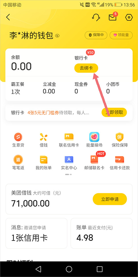 2、在打开的新页面中,点击【银行卡】模块中的【去绑卡】