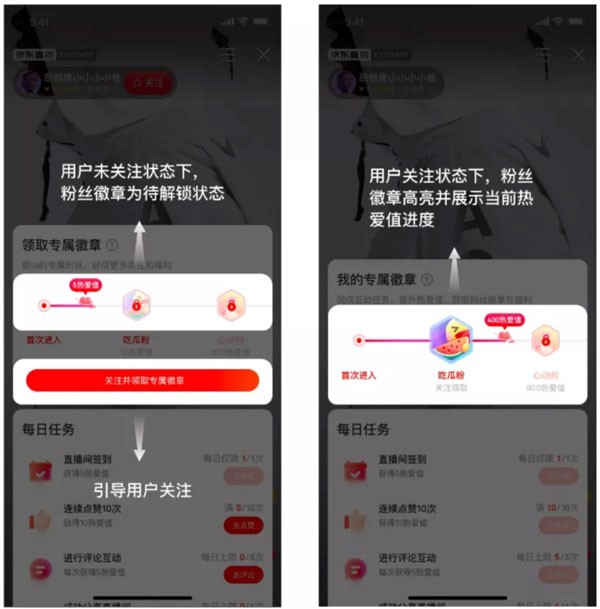 主播开通粉丝热爱值功能后,用户可在直播间看到与该主播的热爱值及当前等级,并可通过热爱值专属入口,到达互动任务区域,完成互动任务,提高热爱值,解锁专属徽章,享受专有权益。