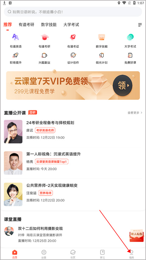 1、打开网易云课堂app苹果版,点击右下方我的。