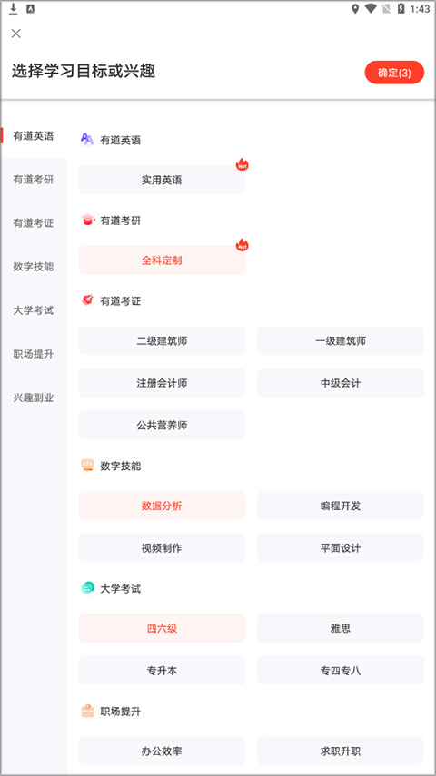 2、在这你可以选择你需要学习的类型,完成后点击右上方的确定即可。