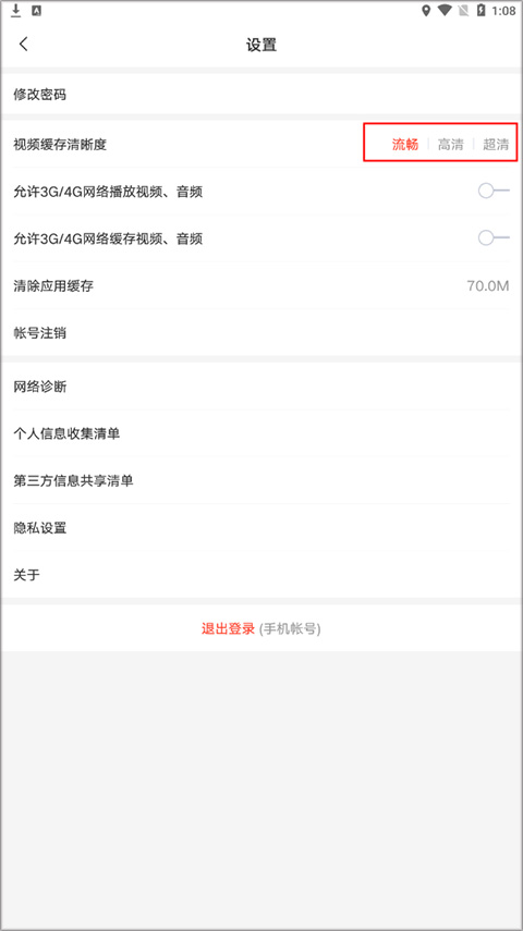 3、找到视频缓存清晰度,你可以选择流畅、高清、超强三种清晰度缓存方式。