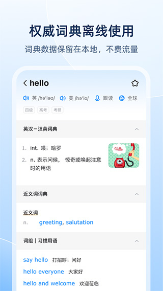 2、离线使用, 为您节省流量。查词无需联网,发音功能在联网下载免费的语音库后亦可离线使用