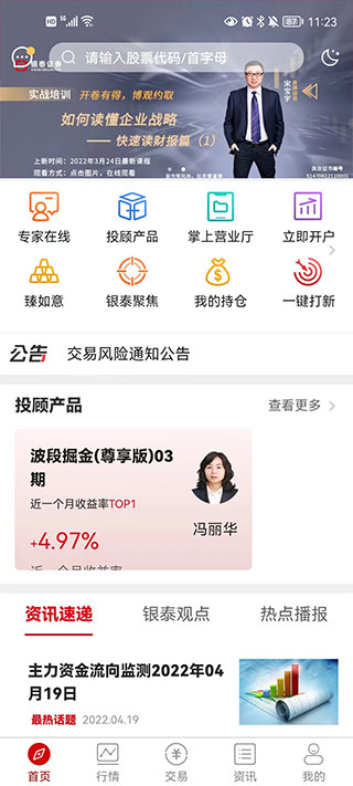 该软件不仅提供了非常专业的专家在线服务,同时还拥有投顾产品、掌上营业厅、银泰聚焦、持仓等功能。