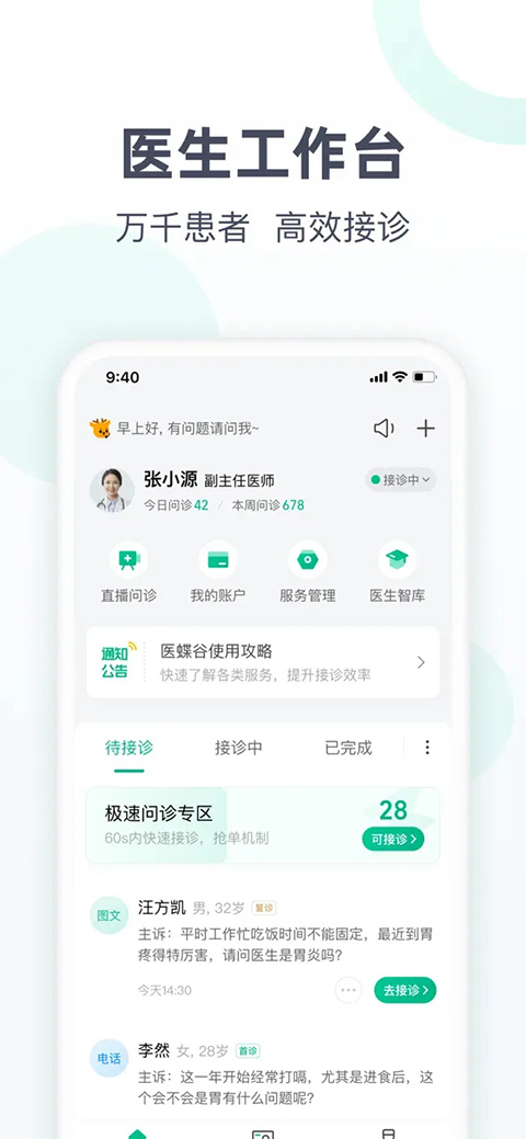 医生可在系统中设置的指定时段内,通过图文、电话以及语音等方式,为更多的患者提供专业医学咨询服务。其中专家图文问诊和电话问诊可自主定价;极速问诊服务由平台统一定价,定向结算。