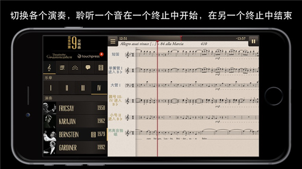 贝多芬第九交响曲app苹果版是运行在苹果ios平台上的手机app应用,该应用拥有德意志唱片公司的四个传奇录音版本,不同年代不同版本可以任意切换,通过一个卓越的应用,使用户前所未有地领悟这一标志性作品。目前贝多芬第9交响曲app可以免费试听2分钟,18元解锁全部内容,四个指挥家版本,全程实时解说和乐谱,还有方位图,喜欢贝多芬第九交响曲的朋友请下载。